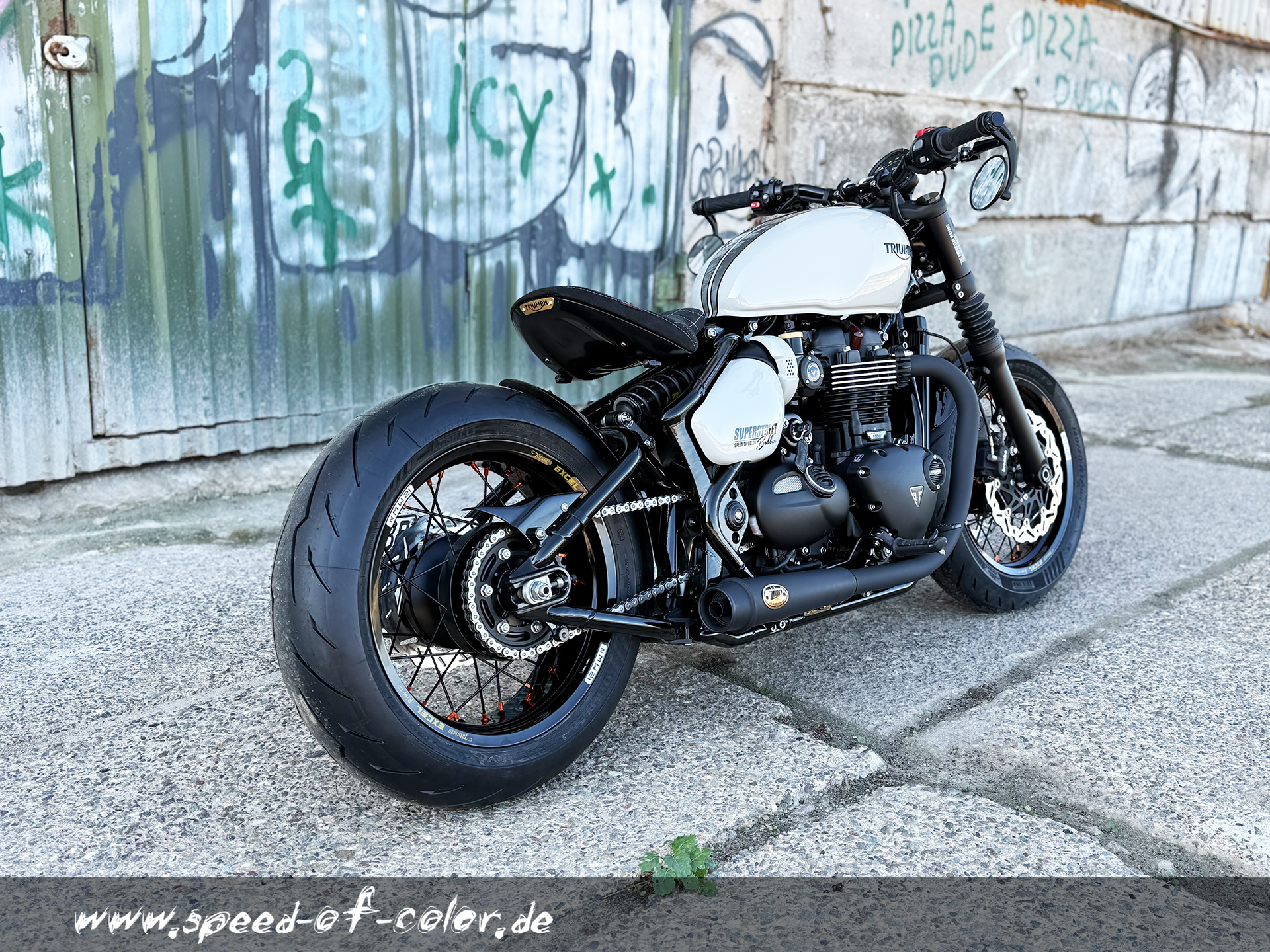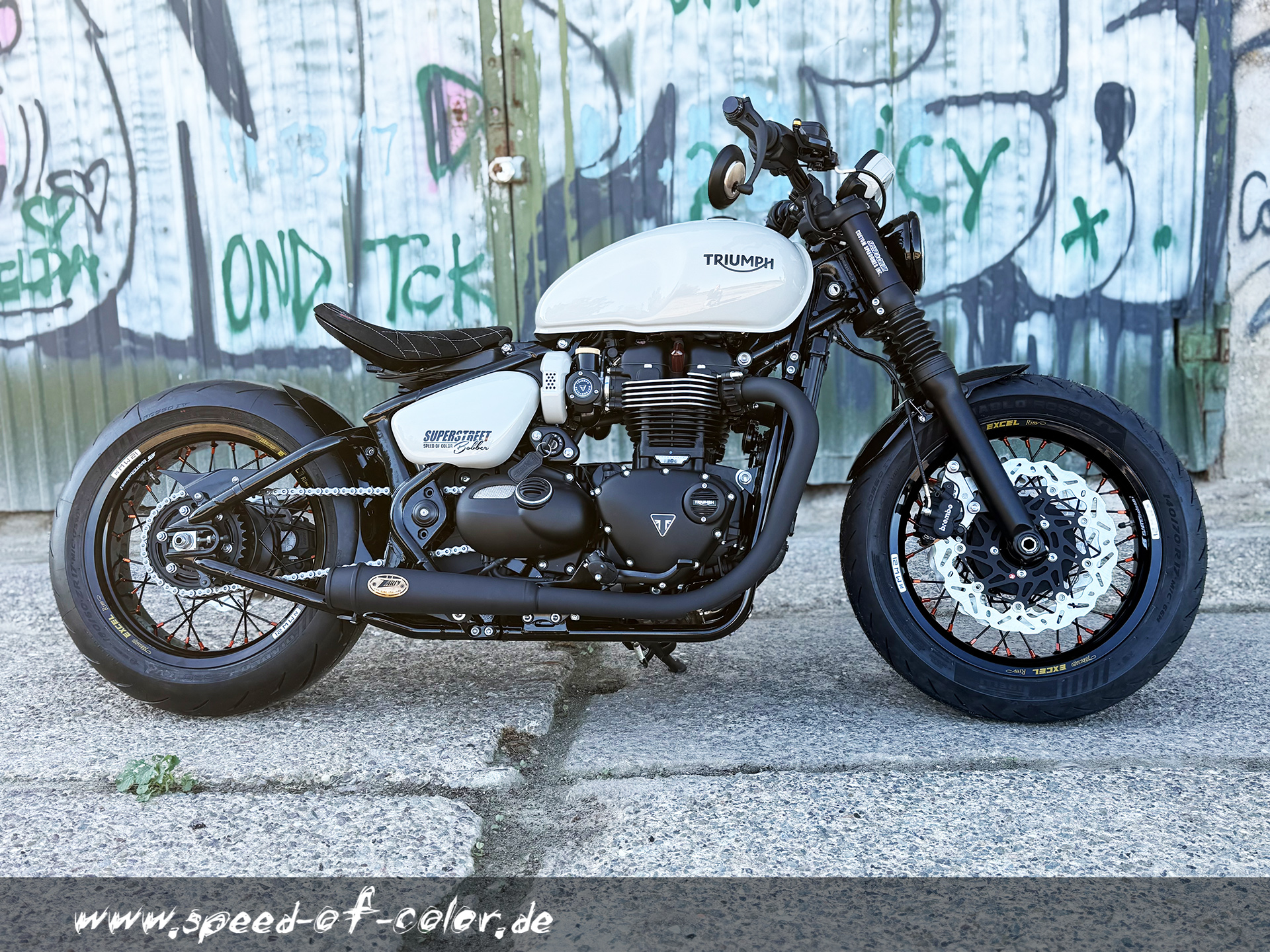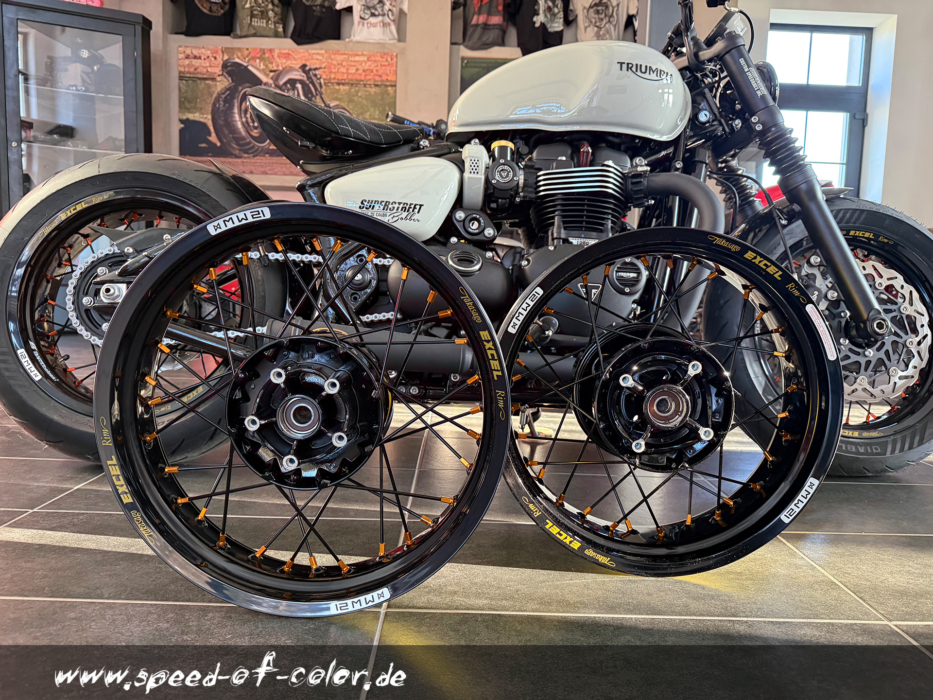 Alu-Felgen von Excel-Takasago passend für die Triumph Bobber Modelle.Für die Herstellung der gewünschten Felge müssen die eigenen Radnaben zu uns geschickt werden.Felegnbreite vorn 3,5x17 Zoll und hinten 5,0x17 Zoll (andere Maße sind auf Wunsch natürlich möglich).So kann eine Reifenbreite von 140mm vorn und 180mm hinten gefahren werden.